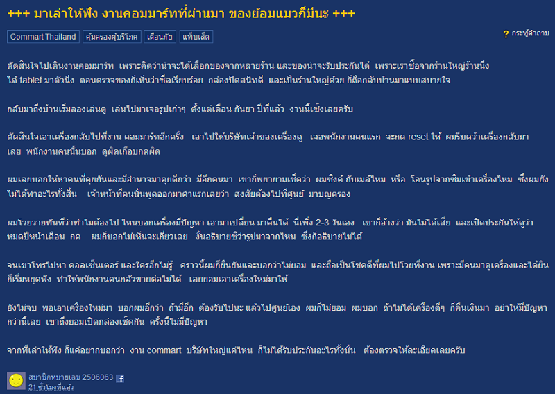 ซึ่งเนื้อหาภายในบทความเจ้าของกระทู้ได้มาพูดถึงกรณีที่ตนเองได้ไปเดินช้อปในงาน Commart และได้เลือกซื้อแท็บเล็ตจากร้านค้าดังแห่งหนึ่ง เมื่อตรวจสอบแล้วพบว่ากล่องนั้นถูกซีลปิดสนิทเรียบร้อย แต่เมื่อกลับมาลองใช้งานที่บ้านพบว่ามีรูปภาพเก่าๆ เมื่อปีก่อนหลงเหลืออยู่ในเครื่อง นั่นหมายความว่าแท็บเล็ตเครื่องดังกล่าวไม่ใช่ของมือหนึ่งแน่นอน เจ้าของกระทู้จึงได้กลับไปที่ร้านค้าดังกล่าวภายในงาน Commart อีกครั้ง