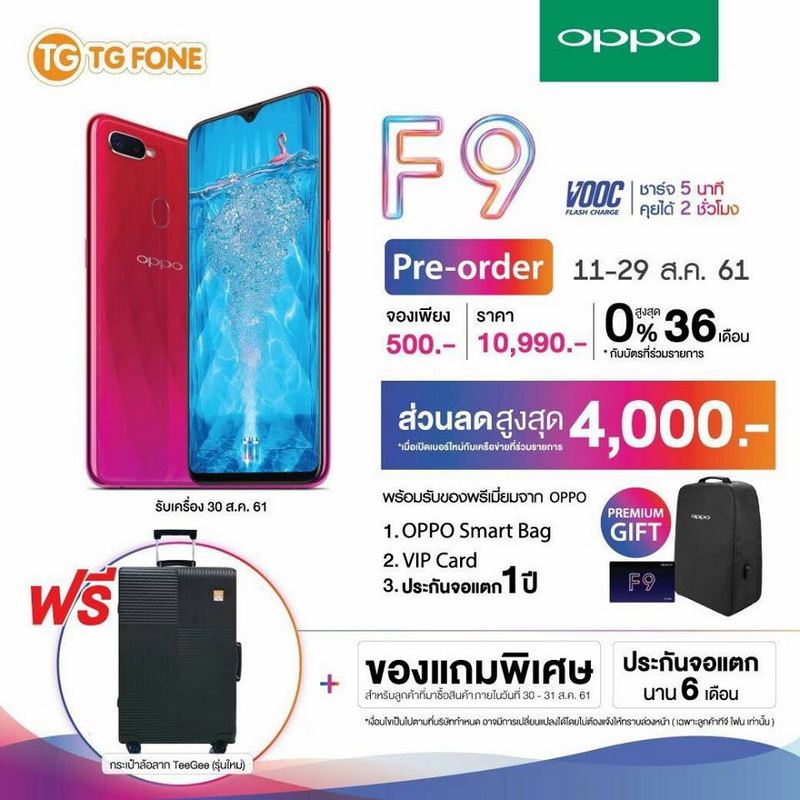 พร้อมรับของแถมพิเศษสุดพรีเมียมเป็นกระเป๋า OPPO Smart Bag สุดเท่ และบัตร VIP Card ประกันหน้าจอแตก 1 ปีเต็ม ซึ่งวันนี้ทางทีมงานจะขอพาไปชมโปรโมชั่นการจอง OPPO F9 จากร้านตัวแทนต่างๆ ที่มีโปรโมชั่น และของแถมที่แตกต่างกันไป ส่วนจะมีอะไรน่าสนใจบ้างนั้น เราไปติดตามกันเลยค่ะ