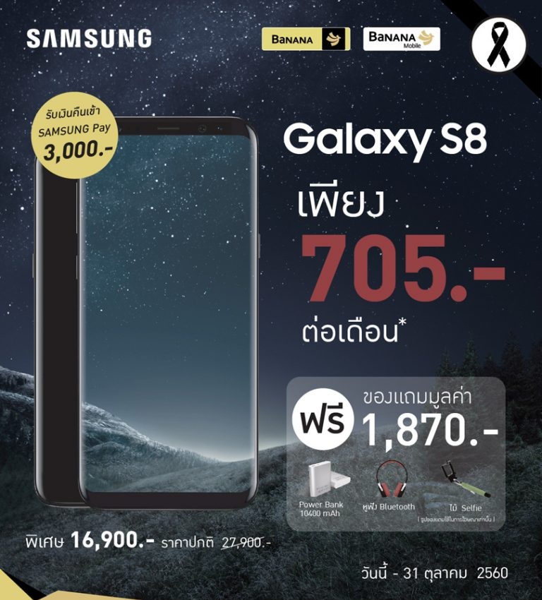 สวัสดีเพื่อนๆ ผู้ติดตาม ninethaiphone ทุกท่านค่ะ วันนี้เรามีโปรโมชั่นดีๆ มาฝากกันอีกเช่นเคย ในครั้งนี้เราจะขอนำเสนอโปรโมชั่น Samsung Galaxy S8 สุดคุ้ม! ที่ร้าน BaNANA IT ที่ให้ผ่อนเบาๆ 0% นานสูงสุด 24 เดือน ผ่านบัตรเครดิตที่ร่วมรายการเพียงเดือนละ 705 บาทเท่านั้น โปรโมชั่นเริ่มแล้ว วันนี้ – 31 ตุลาคม 2560 เราไปชมรายละเอียดทั้งหมดกันเลยค่ะ