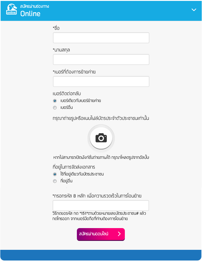 สำหรับขั้นตอนการย้ายค่ายช่องทางออนไลน์ คลิก เพื่อนๆ จะต้องกรอก ชื่อ-นามสกุล, หมายเลขเบอร์ที่ต้องการย้ายค่าย, เบอร์ติดต่อกลับ, แนบไฟล์สำเนาบัตรประชาชน, ที่อยู่ในการจัดส่งเอกสาร และกรอกรหัส 8 หลัก เพื่อความรวดเร็วในการโอนย้าย (วิธีกดขอรหัส กด *151*ตามด้วยหมายเลขบัตรประชาชน# แล้วกดโทรออก จากเบอร์มือถือที่ต้องการโอนย้าย)