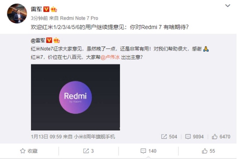 ล่าสุดทาง Lei Jun ซีอีโอ ของ Xiaomi ได้ออกมาเปิดเผยข้อมูลเกี่ยวกับ Redmi 7 ให้ทราบกันแล้วว่า Redmi 7 ถูกจัดวางให้เป็นสมาร์ทโฟนที่มีจุดเด่นตรงที่แบตเตอรี่สุดอึด 4000 mAh ช่องเสียบหูฟัง 3.5 มม. ที่ยังคงมีให้ใช้งานอยู่ โดย Redmi 7 นั้นมีราคาวางจำหน่ายอยู่ที่ 700 – 800 หยวน หรือประมาณ 3,500 – 4,000 บาท ซี่งหากเทียบสเปคเครื่องกับราคาแล้วถือว่าคุ้มมากๆ เลยทีเดียว