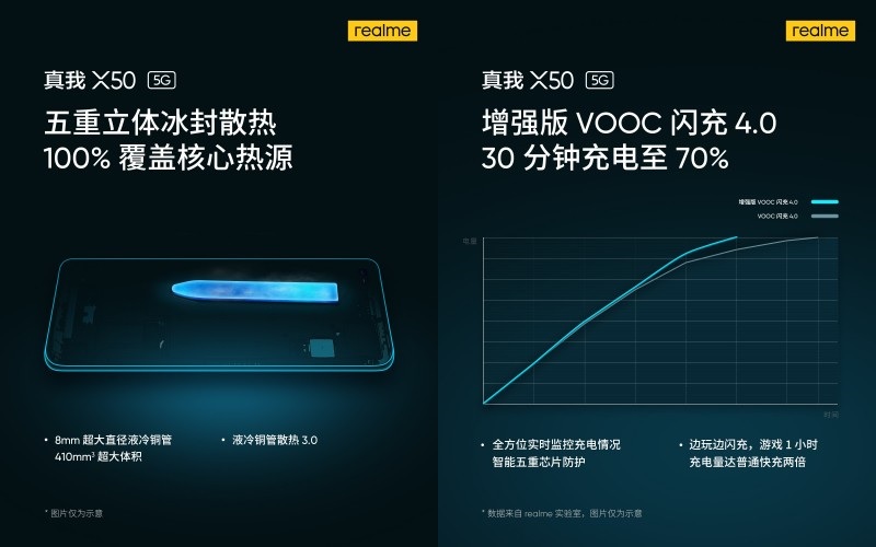 ก่อนหน้านี้ realme X50 เคยถูกเปิดเผยว่าจะมีหน้าจอขนาดใหญ่ 6.6 นิ้ว ดีไซน์เจาะรูรองรับการติดตั้งกล้องเซลฟี่คู่ ขับเคลื่อนด้วยขุมพลัง Snapdragon 765G รองรับ 5G ที่สามารถเชื่อมต่อ 5G และ Wi-Fi พร้อมกัน มีระบบระบายความร้อน 5 มิติ เสริมประสิทธิภาพให้ใช้งานได้ยาวนานมากขึ้น และแบตเตอรี่รองรับ VOOC 4.0 ช่วยให้ชาร์จถึง 70% ภายใน 30 นาที