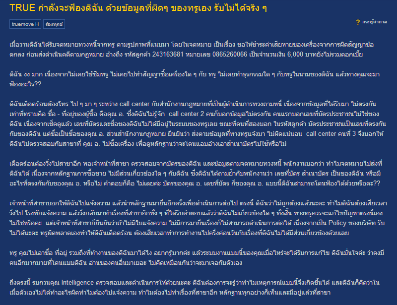 ที่ขอให้ชำระค่าเสียหายของเครื่องจากการผิดสัญญาข้อตกลง ก่อนส่งดำเนินคดีตามกฏหมาย ซึ่งเป็นจำนวนเงิน 6,000 บาทไม่รวมดอกเบี้ย นั่นทำให้เจ้าของกระทู้งงกับเหตุการณ์ที่เกิดขึ้นเป็นอย่างมาก เนื่องจากตนเองนั้นไม่เคยทำสัญญาซื้อเครื่องกับทรูเลยแม้แต่น้อย และไม่เคยทำธุรกรรมใดๆ กับทรูในนามของตนเองด้วย