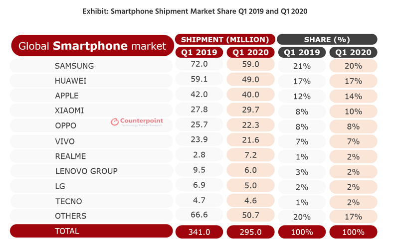 นอกจากนี้ผลสำรวจจาก Counterpoint ยังระบุว่าตลาดสมาร์ทโฟนทั่วโลกในไตรมาสที่ 1 ปี 2563 ได้รับผลกระทบเชิงลบซึ่งส่งผลให้ยอดขายสมาร์ทโฟนทั่วโลกลดลง 13% แต่ในทางกลับกัน realme ถือเป็นแบรนด์สมาร์ทโฟนเพียงแบรนด์เดียวที่ยังคงเติบโตอย่างไม่หยุดยั้ง โดยเติบโตขึ้น 157% เมื่อเปรียบเทียบกับไตรมาสที่ 1 ในปี 2562