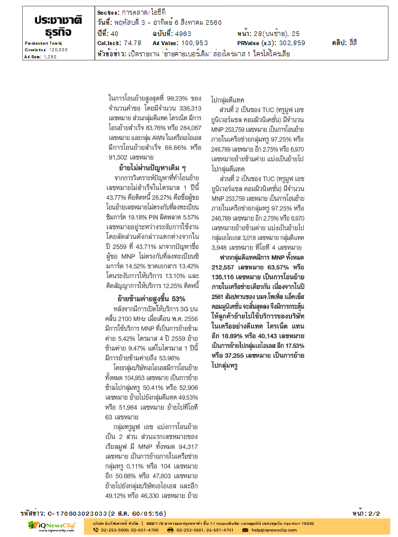 – โอนย้ายทั้งหมด 253,759 เลขหมาย (TUC)