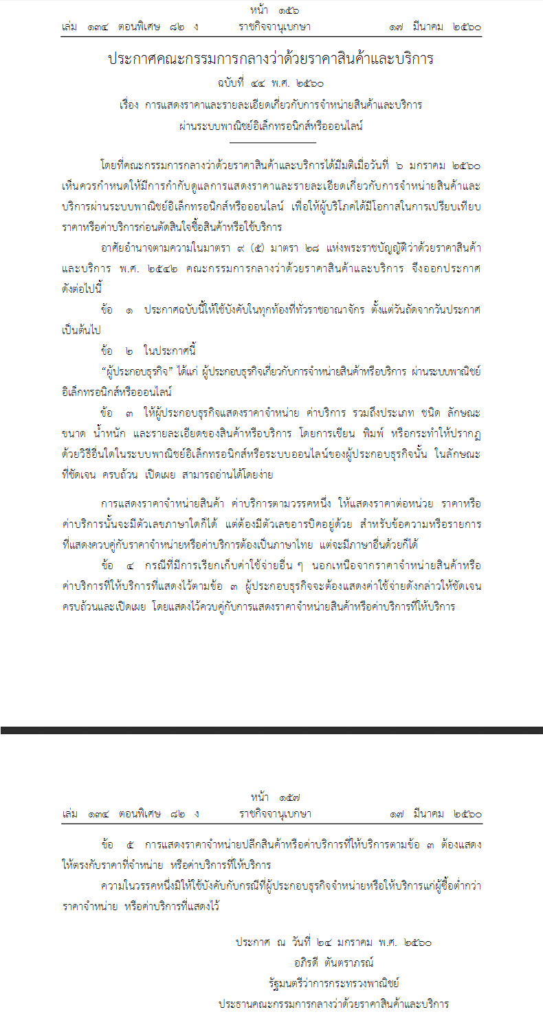 เรียกได้ว่ากำลังเป็นกระแสเลยก็ว่าได้สำหรับราชกิจจานุเบกษาประกาศคณะกรรมการกลางว่าด้วยราคาสินค้าและบริการ “เรื่องการแสดงรายละเอียดเกี่ยวกับการจำหน่ายสินค้าและบริการผ่านระบบพาณิชย์อิเล็กทรอนิกส์หรือออนไลน์” โดยมีคำสั่งชัดเจนว่าพ่อค้าแม่ขายออนไลน์จะต้องแสดงราคา และรายละเอียดสินค้านั้นๆ ให้ครบถ้วน เลิกให้สอบถามราคาหรืออื่นๆ ทางข้อความ in box