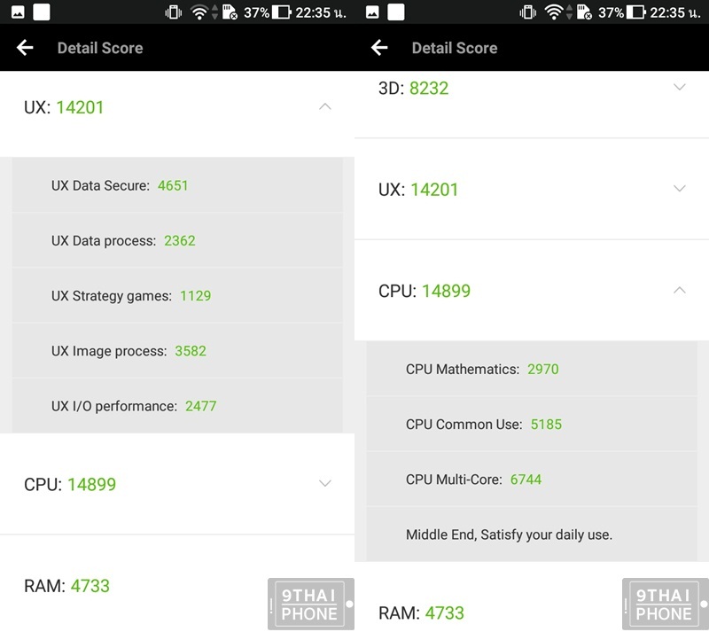 พบว่าสามารถทำคะแนนรวมอยู่ที่ 42065 คะแนน ถือว่าค่อนข้างน้อยเมื่อเทียบกับ Nokia 5 ที่มาพร้อมชิปประมวลผล Snapdragon 430 แบบ Octa Core ความเร็ว 1.4GHz หน่วยประมวลผลกราฟิก Adreno 505 หน่วยความจำ RAM ขนาด 2GB ความจุ 16GB และมีราคาอยู่ที่ 6,490 บาท ที่ทำได้ 45364 คะแนน (ชมรีวิว)