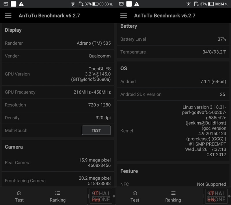 โดยได้คะแนนการทดสอบที่มากกว่า Asus ZenFone 4 Max Pro Edition ที่มาพร้อมชิปประมวลผล Snapdragon 430 แบบ Octa-Core ความเร็ว 1.4GHz หน่วยประมวลผลกราฟิก Adreno 505 หน่วยความจำ RAM ขนาด 3GB ความจุ 32GB ที่คะแนนรวมอยู่ที่ 42065 คะแนน อยู่เพียงเล็กน้อยแทบจะไม่แตกต่างเลยก็ว่าได้ (ชมรีวิว)