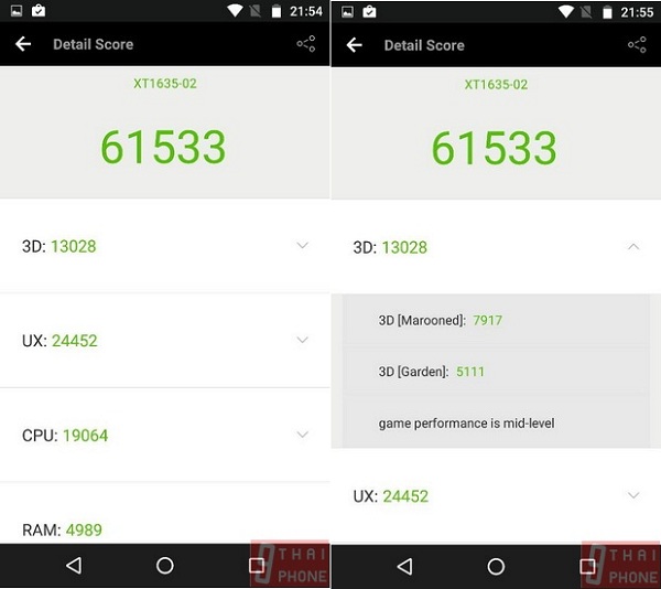 เมื่อลองโหลดแอพพลิเคชั่น Antutu Benchmark แล้วทำการทดสอบประสิทธิภาพของ Moto Z Play พบว่าสามารถทำคะแนนรวมทั้งหมดอยู่ที่ 61533 คะแนน ได้คะแนนรวมมากกว่า Lenovo VIBE K5 Note ที่ทำไปได้ 46943 คะแนน (ชมรีวิว) และ Moto X Play ที่ทำไปได้ 42428 คะแนน (ชมรีวิว)