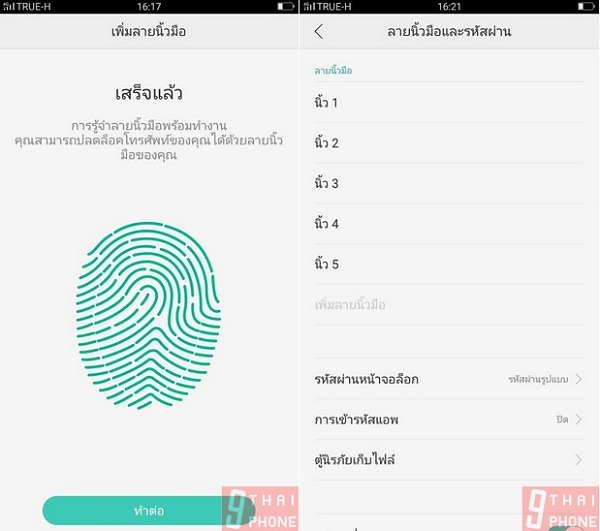 สำหรับการตั้งค่าสแกนลายนิ้วมือ OPPO F1s สามารถจดจำลายนิ้วมือได้สูงสุดถึง 5 ลายนิ้วมือ และสามารถปลดล็อกตัวเครื่องได้อย่างรวดเร็วเพียง 0.22 วินาทีเท่านั้น
