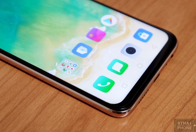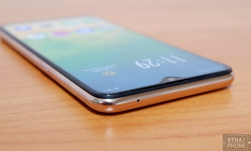 ด้านหน้า ใช้จอแสดงผล LTPS IPS แบบ Full Screen ขนาด 6.3 นิ้ว ความละเอียด Full HD+ มีรอยบากทรงหยดน้ำแบบใหม่ดีไซน์ Waterdrop Screen จออัตราส่วน 19.5:9 สัดส่วนพื้นที่แสดงผลอยู่ที่ 90.8% ให้ภาพที่เต็มตา ป้องกันรอยขีดข่วนด้วยกระจก Corning Gorilla Glass ผู้ใช้งานสามารถดูหนัง, ฟังเพลง, เล่นเกม หรือท่องอินเทอร์เน็ตได้แบบเต็มอรรถรสผ่านจอกว้างเต็มสายตา และหากสังเกตดีๆ บนหน้าจอจะมีขอบสีขาวเล็กๆ บริเวณฝั่งขวามือ ส่วนนี้เราเรียกกันว่า Smart Side Bar เดี๋ยวเราค่อยไปทำความรู้จักกันอีกครั้งในหัวข้อ Interface ค่ะ