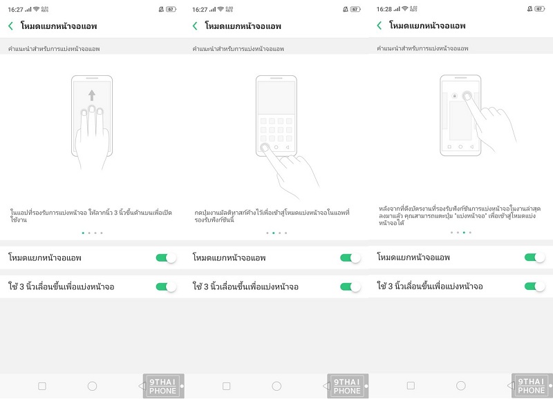 สำหรับการใช้งานฟังก์ชัน Split Screen สามารถเข้าถึงได้หลากหลายวิธี อาทิ การลาก 3 นิ้วขึ้นด้านบนเพื่อเปิดการใช้งาน หรือการกดค้างไปที่ปุ่ม Recent Apps เพื่อเข้าสู่โหมดแบ่งหน้าจอในแอปฯ ที่รองรับ เป็นต้น