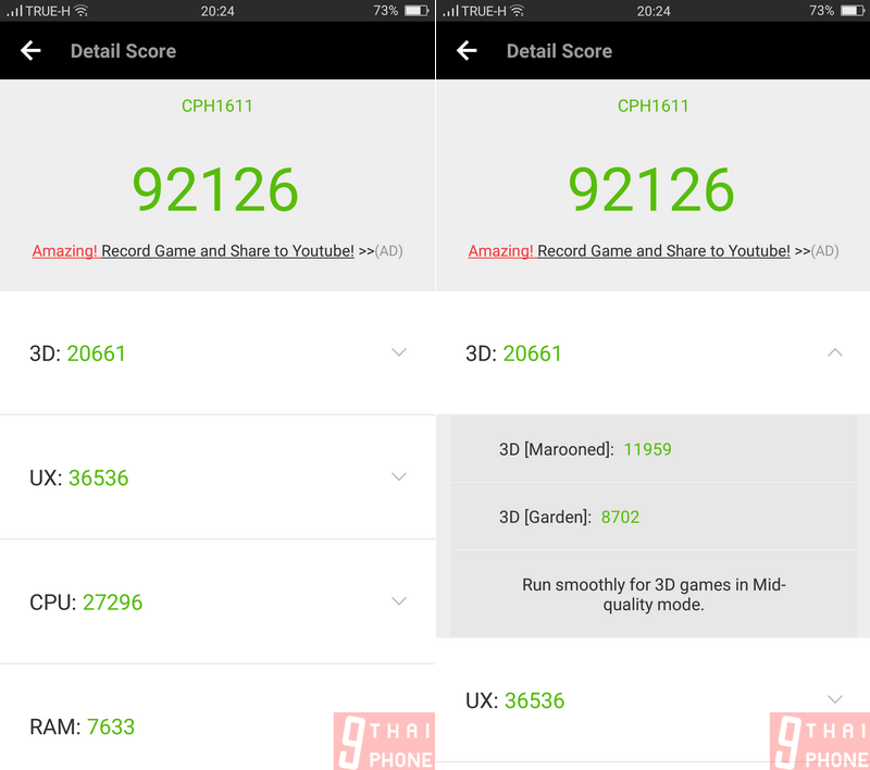 OPPO R9s Plus ได้คะแนนทดสอบประสิทธิภาพการใช้งานผ่านแอปพลิเคชั่น AnTuTu เวอร์ชั่นล่าสุด พบว่าสามารถทำคะแนนรวมอยู่ที่ 92126 คะแนน เฉียดแสนกันเลยทีเดียว ขณะที่ OPPO R9s จากบทความรีวิวก่อนหน้าที่มาพร้อมขุมพลัง Snapdragon 625 Octa-core ความเร็ว 2.0GHz หน่วยประมวลผลภาพกราฟิก Adreno 506 ทำคะแนนรวมอยู่ที่ 65876 คะแนน (ชมรีวิว) ถือว่ารุ่น Plus ทำได้ดีเลยทีเดียว