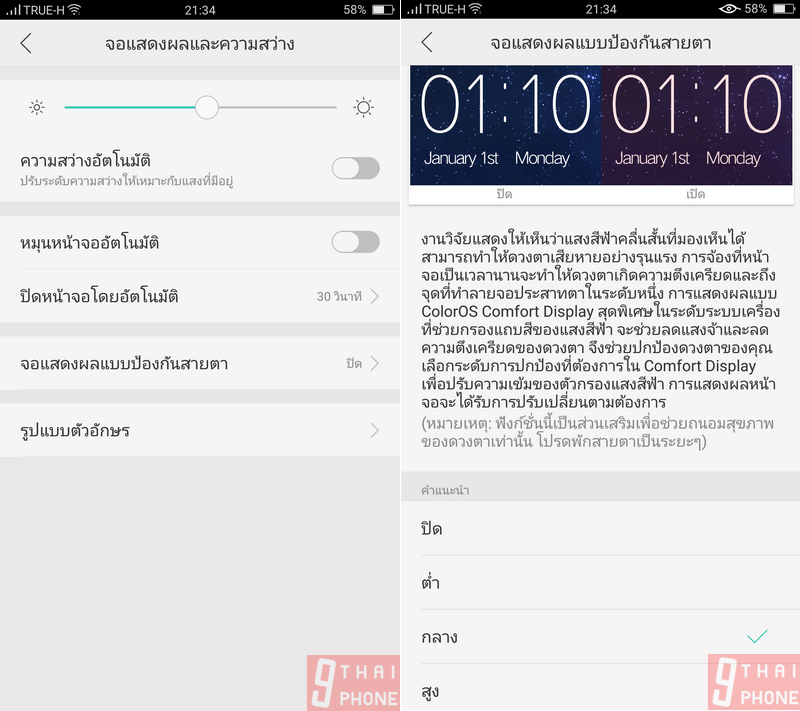 โหมดถนอมสายตา Bluelight Filter ระบบจะทำการตัดแสงสีฟ้าของหน้าจอออกเป็นโทนเหลืองนวล สามารถปรับได้ 3 ระดับ คือ ระดับต่ำ, ระดับกลาง ไปจนถึงระดับสูง