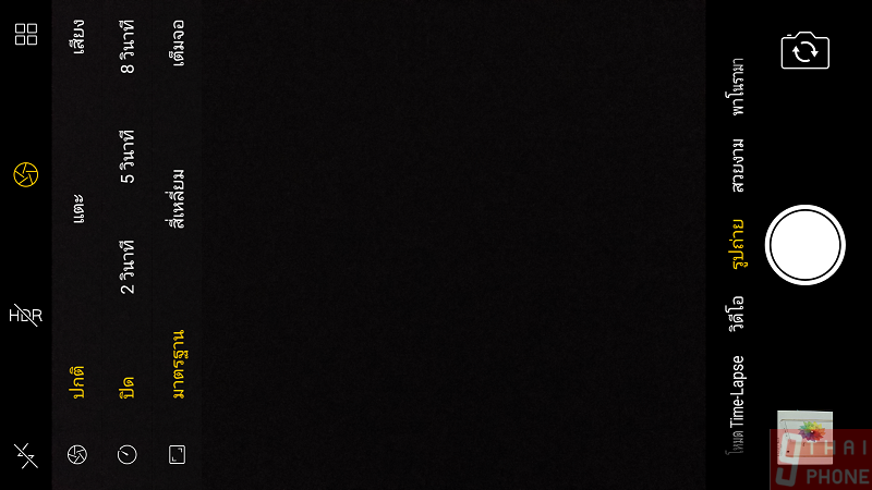โหมดถ่ายภาพปกติ มีให้เลือกเปิดใช้งาน HDR, แฟลช, เลือกรูปแบบในการกดถ่ายภาพ, ตั้งเวลาในการถ่ายภาพ และเลือกปรับอัตราส่วนภาพถ่ายตามที่ต้องการ