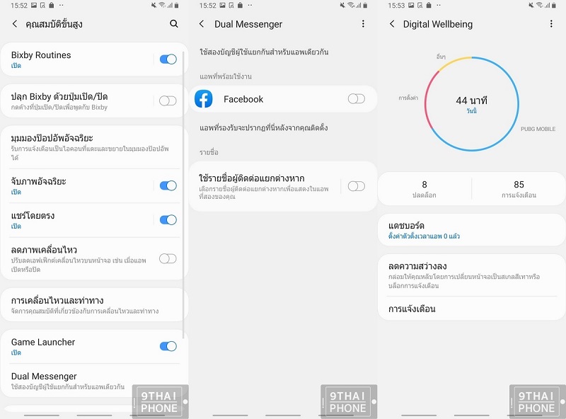 ในส่วนนี้เป็นเมนูคุณสมบัติขั้นสูง ไม่ว่าจะเป็นการใช้งาน Bixby, กล้องอัจฉริยะ หรือตั้งค่าเปิดใช้งาน Dual Messenger และ Digital Wellbeing แสดงการใช้งานต่างๆ บนสมาร์ทโฟน