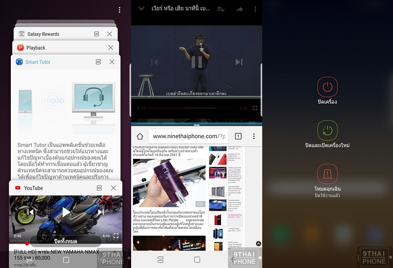หากกดไปที่ปุ่ม Recent Apps จะขึ้นหน้าแอปฯ ที่ใช้งานไปแล้วทั้งหมด สามารถเคลียร์แอปฯ ได้อย่างรวดเร็วด้วยการกดไปที่ปิดทั้งหมด, ส่วนการใช้งานแอปฯ 2 หน้าจอ หรือ Multi Window ให้เพื่อนๆ กดค้างไปที่ปุ่ม Recent Apps แล้วเลือกใช้งานแอปฯ หรือเว็บที่ต้องการ สำหรับการปิด-เปิดเครื่อง, รีสตาร์ท และเปิดโหมดฉุกเฉิน ทำได้ด้วยการกดค้างไปที่ปุ่มพาวเวอร์ข้างตัวเครื่องค่ะ