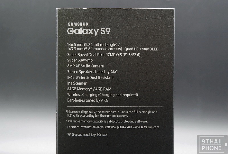 ด้านหลังกล่องมีการระบุสเปคการใช้งานเด่นแบบคร่าวๆ อาทิ ใช้หน้าจอ Super AMOLED ความละเอียด Quad HD+, กล้องหลังความละเอียด 12MP พร้อมกันสั่น OIS ค่ารูรับแสงปรับได้ f/1.5 และ f/2.4, รองรับการบันทึกวิดีโอแบบ Super Slow-mo, กล้องหน้าเซลฟี่ความละเอียด 8MP, กันน้ำกันฝุ่นได้ตามมาตรฐาน IP68 และมีสแกนม่านตา เป็นต้น