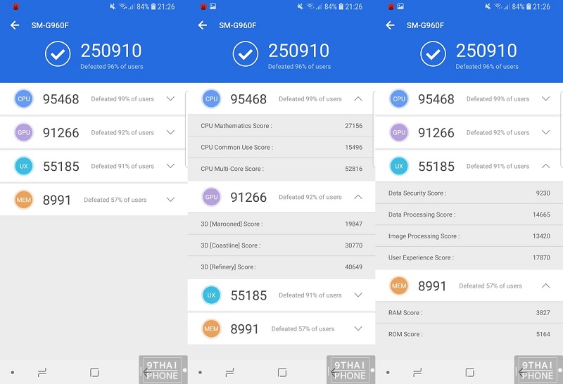 เมื่อนำ Samsung Galaxy S9 ที่มาพร้อมชิปประมวลผล Exynos 9810 แบบ Octa Core ความเร็ว 2.8GHz หน่วยประมวลภาพกราฟิก Mali-G72 MP18 และทำงานบนระบบปฏิบัติการ Android 8.0 Oreo เข้าทดสอบประสิทธิภาพการใช้งานผ่านแอปพลิเคชั่น AnTuTu เวอร์ชั่นล่าสุด พบว่าสามารถทำคะแนนรวมอยู่ที่ 2 แสนกว่าๆ ถือว่าทำออกมาได้ดีสำหรับสมาร์ทโฟนระดับเรือธง นอกจากนี้การใช้งานจริงยังทำงานได้แบบมีประสิทธิภาพ เล่นเกมสีสันสดใสไม่กระตุก เล่นได้แบบลื่นๆ เลยค่ะ