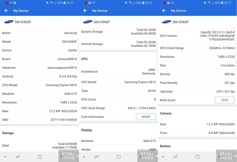 สำหรับข้อมูลสเปคการใช้งานของ Samsung Galaxy S9 ตามฐานข้อมูลของแอปฯ AnTuTu เวอร์ชั่นล่าสุด ระบุว่ามาพร้อมรหัสโมเดล SM-G960F, ทำงานบนระบบปฏิบัติการ Android 8.0, ใช้ชิปเซ็ต Exynos 9810, จีพียู Mali-G72, หน้าจอความละเอียด 2220×1080 พิกเซล, กล้องหลัง 12.2MP, กล้องหน้า 8MP, หน่วยความจำแรมที่ใช้งานได้ทั้งหมด 1179MB, ความจุที่ใช้งานได้ทั้งหมด 46.80GB และรองรับ NFC เป็นต้น
