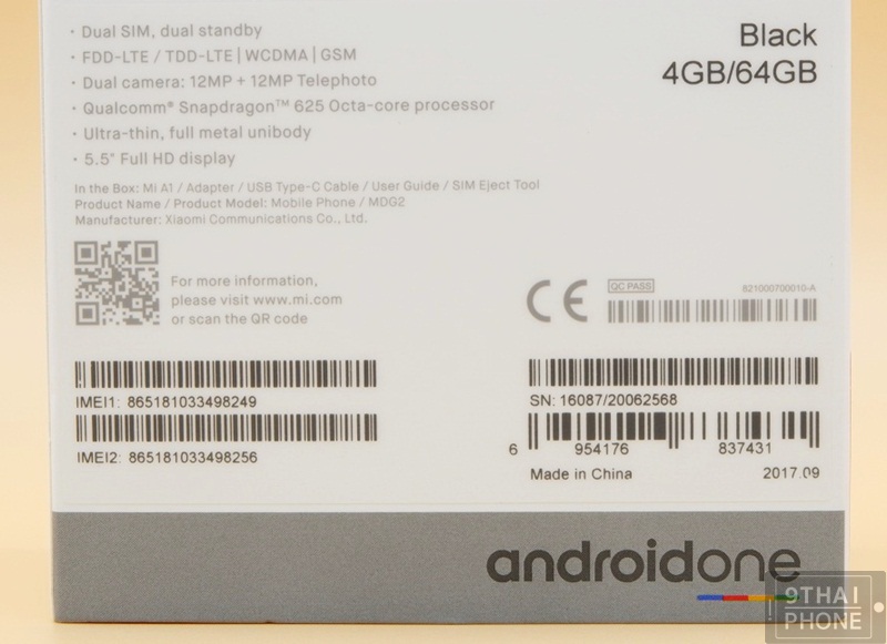ด้านหลังส่วนล่าง มีข้อความงานดีไซน์, เลขโมเดลตัวเครื่อง และเครื่องหมายสมาร์ทโฟนในโครงการ Android One สกรีนเอาไว้