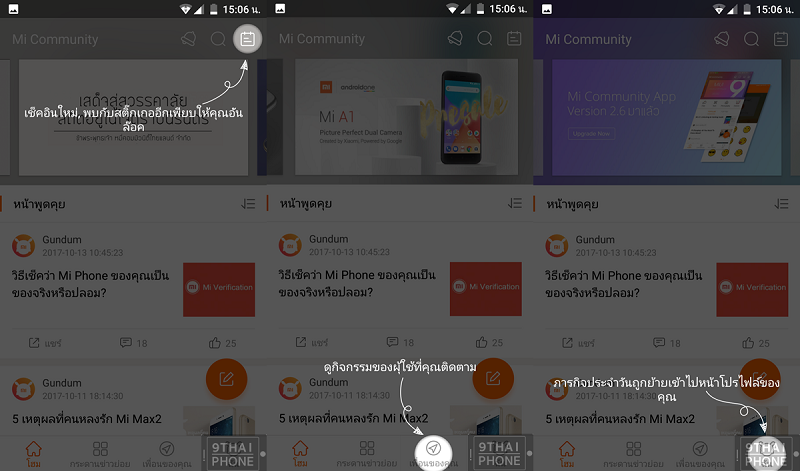 Mi Community หรือหน้าพูดคุยเกี่ยวกับอุปกรณ์ Xiaomi เป็นเพจหลักของแฟนคลับ Mi ที่จะช่วยให้ผู้ใช้งานสามารถแบ่งปันความคิดเห็น และโต้ตอบกับแฟนคลับ Mi ในระหว่างเดินทาง มีอินเตอร์เฟซที่รวดเร็ว และใช้งานง่าย ไม่ว่าจะเป็นการโพสต์กระทู้ การตอบกลับ การอ่านข่าวและการโต้ตอบกับผู้อื่น