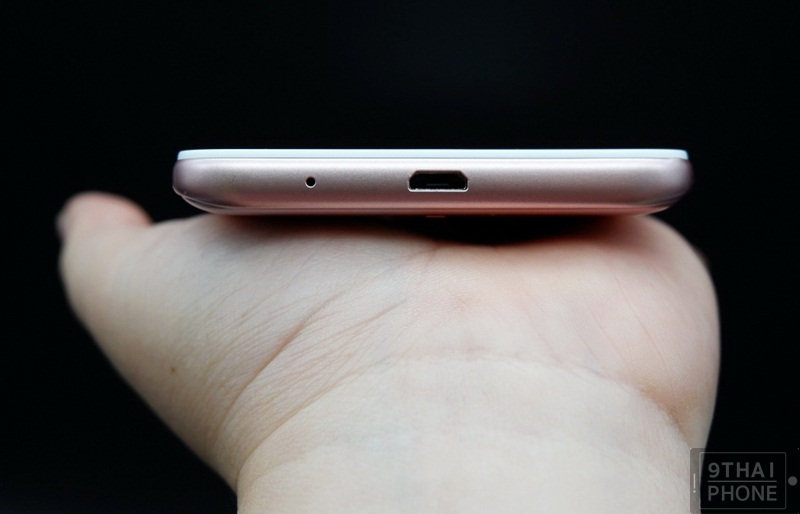 ด้านล่างตัวเครื่อง พบรูไมโครโฟนสำหรับสนทนา และพอร์ตเชื่อมต่อ microUSB