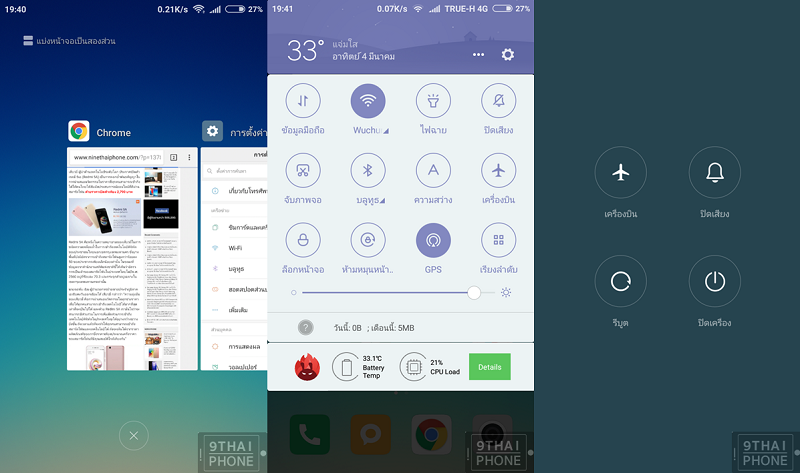 หากกดไปที่ปุ่ม Recent App จะพบกับแอปฯ ที่ใช้งานไปแล้วทั้งหมด สามารถเคลียร์แอปฯ ทั้งหมดด้วยการกดที่ “ล้างทั้งหมด”, เมื่อสไลด์หน้าจอด้านบนลงล่างจะพาเข้าสู่หน้าแจ้งเตือนต่างๆ และ Quick Setting เปิดการใช้งานต่างๆ ที่เข้าถึงได้อย่างสะดวกรวดเร็ว และกดเปิด-ปิดหรือรีสตาร์ทเครื่องได้ด้วยการกดค้างไปที่ปุ่มพาวเวอร์ข้างตัวเครื่อง
