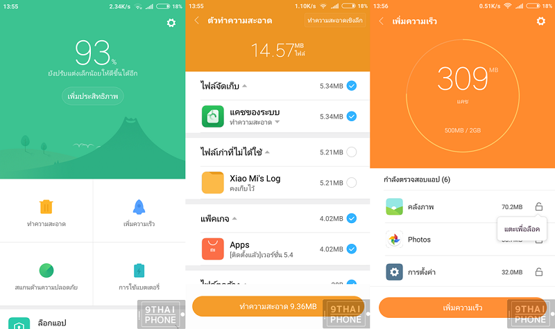 แอปฯ ความปลอดภัยใช้บูตเครื่องเพื่อเพิ่มความเร็ว, สแกนไวรัส, กำจัดแคชภายในตัวเครื่อง, ตั้งค่าการใช้งานแบตเตอรี่ เพื่อเพิ่มประสิทธิภาพการใช้งานให้ดีเยี่ยมอยู่เสมอๆ และทำความสะอาดไฟล์ โฟลเดอร์ และข้อมูลอื่นๆ ภายในตัวเครื่อง