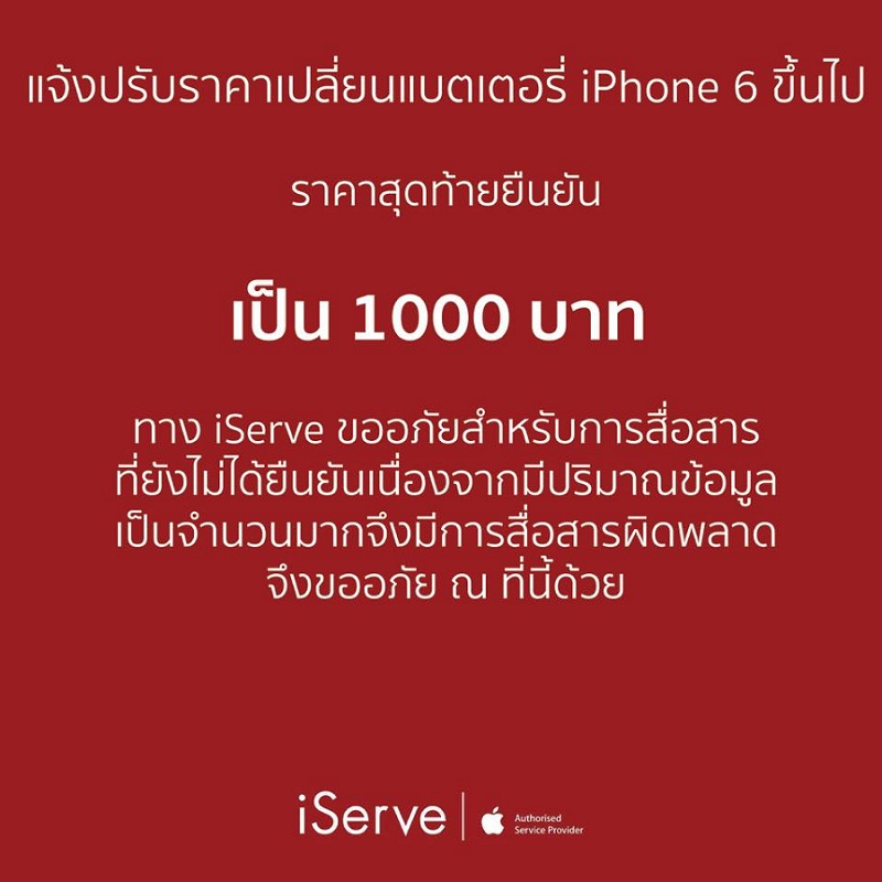 สำหรับเพื่อนๆ ท่านใดที่ใช้งาน iPhone 6, iPhone 6 Plus, iPhone 6s, iPhone 6s Plus, iPhone 7, iPhone 7 Plus หรือ iPhone SE และแบตเตอรี่เริ่มเสื่อมสภาพแล้ว เพื่อนๆ สามารถนำเครื่องไปเปลี่ยนแบตเตอรี่ของแท้ก้อนใหม่ได้ที่ iCare หรือ iServe (เฉพาะ iPhone 6 ขึ้นไป) ในราคาพิเศษเพียงแค่ 1,000 บาทเท่านั้น โดยไม่เสียค่าใช้จ่ายใดๆ เพิ่มเติม