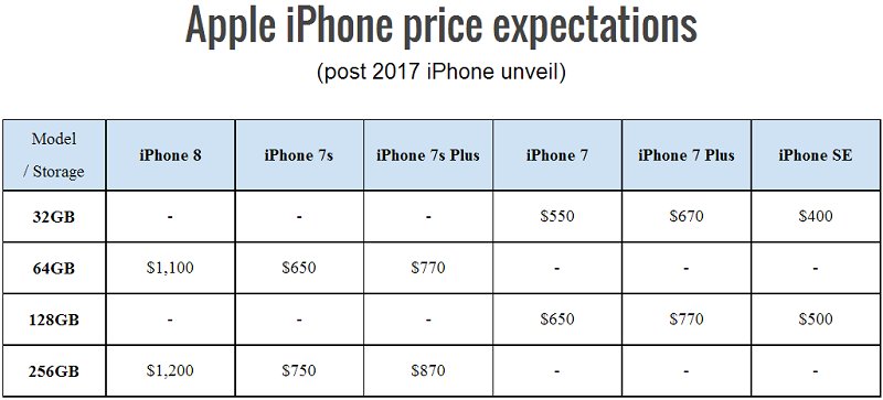 ล่าสุด Phonearena เว็บไซต์สื่อข่าวต่างประเทศได้เผยราคาและกำหนดการของ iPhone 8, iPhone 7s และ iPhone 7s Plus ออกมาให้เราได้ทราบกัน จากข้อมูลระบุว่าสมาร์ทโฟนรุ่นใหม่ทั้งหมดจะเปิดตัวในวันที่ 5 หรือ 6 กันยายน 2017 ซึ่ง iPhone 7s และ iPhone 7s Plus จะเริ่มวางจำหน่าย 15 หรือ 22 กันยายน 2017 ขณะที่ iPhone 8 จะวางจำหน่ายในภายหลัง เราไปชมรายละเอียดราคาวางจำหน่ายกันเลยค่ะ