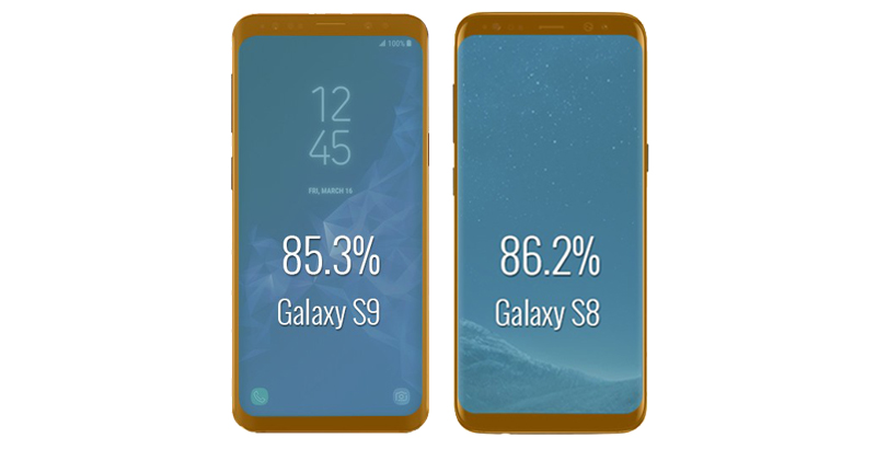 โดยทาง Gsmarena ได้ทำการหาอัตราส่วนขนาดจอแสดงผลเมื่อเทียบกับขนาดบอดี้ ว่าสมาร์ทโฟนรุ่นไหนจะมีขนาดหน้าจอที่ใหญ่กว่ากัน โดยอัตราส่วนของ Galaxy S8/Galaxy S8+ อยู่ที่ 86.2% และ 87.5% ตามลำดับ ขณะที่สมาร์ทโฟนรุ่นใหม่อย่าง Galaxy S9/Galaxy S9+ มีอัตราส่วนอยู่ที่ 85.3% และ 86.2% ตามลำดับ ทำให้พบว่า Galaxy S9/Galaxy S9+ มีขนาดพื้นที่หน้าจอแสดงผลเล็กกว่ารุ่นก่อนหน้า