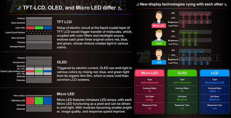 โดยหน้าจอแบบ Micro-LED จะมีข้อดีเหมือนกับหน้าจอแบบ OLED ก็คือการแสดงสีที่แม่นยำ อัตราส่วนการแสดงค่าคอนทราสต์ที่ดีขึ้น ให้สีดำที่แท้จริง ตอบสนองรวดเร็ว แต่ละพิกเซลเปล่งแสงด้วยตัวเอง แต่แตกต่างกันตรงที่หน้าจอแบบ Micro-LED จะมีความบางมากกว่า ประหยัดพลังงานมากกว่า และมีอายุการใช้งานที่มากกว่า