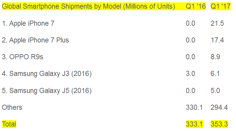 ล่าสุด Strategy Analytics บริษัทวิเคราะห์ตลาด ได้เผยรายงานผลสำรวจสมาร์ทโฟนที่มาแรง และขายดีที่สุด 5 อันดับของโลก ในไตรมาสแรกของปี 2017 เริ่มตั้งแต่ 1 มกราคม – 31 มีนาคม ที่มียอดจัดส่งทั้งสิ้นกว่า 353.3 ล้านเครื่อง เพิ่มขึ้นจากไตรมาสแรกของปี 2016 ที่จัดส่งได้ 333.1 ล้านเครื่อง