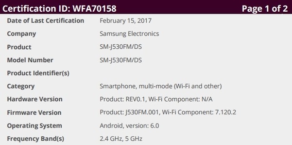 หลังจากที่ Samsung ได้ทำการเปิดตัวสมาร์ทโฟนตระกูล Galaxy A (2017) ไปเมื่อช่วงต้นปีที่ผ่านมา ล่าสุดมีรายงานออกมาว่าจะมีการเปิดตัว Galaxy J (2017) รุ่นใหม่เร็วๆ นี้ โดยมีข้อมูลของ Galaxy J5 (2017) รหัสรุ่น SM-J530FM/DS ที่ได้ผ่านการรับรองมาตรฐานจาก Wi-Fi Alliance เป็นที่เรียบร้อย