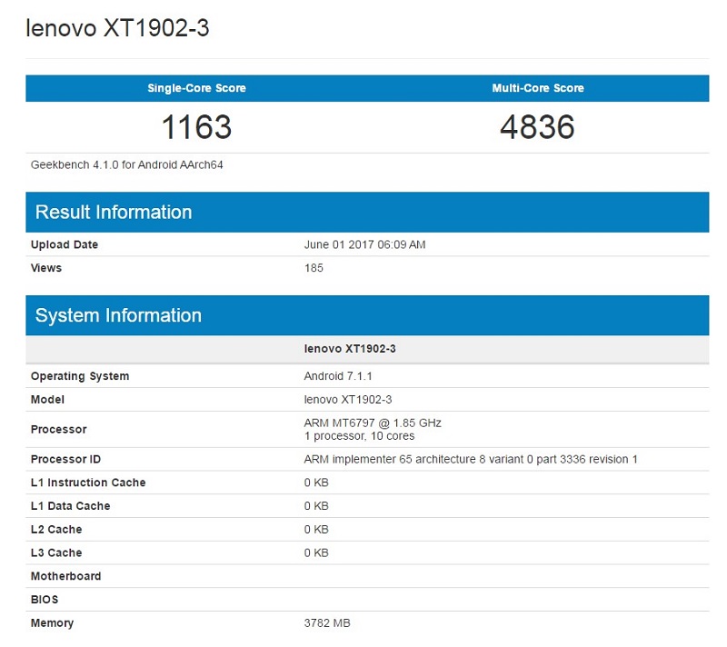 เมื่อไม่นานมานี้ มีการเผยภาพอยู่บนฐานข้อมูล Geekbench เป็นสมาร์ทโฟนรหัส XT1902-3 ของ Lenovo ที่เผยให้เห็นถึงรายละเอียดคร่าวๆ ของสมาร์ทโฟนดังกล่าว โดยสำหรับคะแนนการทดสอบของ Lenovo รหัส XT1902-3 ด้าน Single-Core ทำไปได้ 1163 คะแนน สำหรับด้าน Multi-Core ทำไปได้ 4836 คะแนน