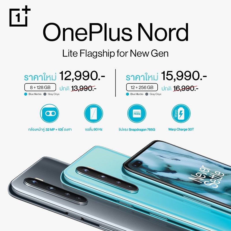 OnePlus Nord สมาร์ตโฟน Lite Flagship for New Gen กล้องหลัง 4 ตัว เลนส์หลักคมชัด 48MP พร้อมเลนส์ Ultra wide, เลนส์มาโคร และเลนส์ Depth สำหรับถ่ายแนวหน้าชัดหลังละลาย และกล้องหน้าคู่ 32MP หน้าจอลื่น 90Hz มากับชิป Snapdragon 765G และชาร์จไว Warp Charge 30T มี 2 สี สไตล์เรียบหรูให้เลือก สี Blue Marble และ สี Gray Onyx ที่มาพร้อมกับราคาใหม่