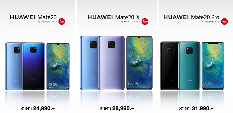 Huawei Mate 20 Series สมาร์ทโฟนเพื่อนรู้ใจที่ทำให้ชีวิตเหนือชั้นกว่าด้วย AI อัจฉริยะ ประกาศราคาในไทยแล้วอย่างเป็นทางการ โดย Huawei Mate 20 ราคา 24,990 บาท Huawei Mate 20X ราคา 28,990 บาท และ Huawei Mate 20 Pro ราคา 31,990 บาท
