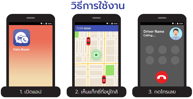 พร้อมปุ่มโทรออกหาคนขับแท็กซี่ได้ในคลิกเดียวโดยไม่ต้องใส่ข้อมูลใดๆทั้งสิ้น แต่หากไม่มีรถแท็กซี่ว่างในขณะนั้นผู้โดยสารสามารถโทรเข้าศูนย์บริการแท็กซี่ในพื้นที่นั้นตามเบอร์ที่โชว์ในแอปฯได้ทันทีนอกจากนั้น สิ่งที่เป็นประโยชน์ในฝั่งของคนขับ แอปฯHalo-Beam จะช่วยลดการมองหน้าจอโทรศัพท์ระหว่างขับรถ เนื่องจากผู้โดยสารจะโทรตรงหาคนขับ ถือเป็นการช่วยเพิ่มความปลอดภัยในการขับขี่เพิ่มมากขึ้นด้วย