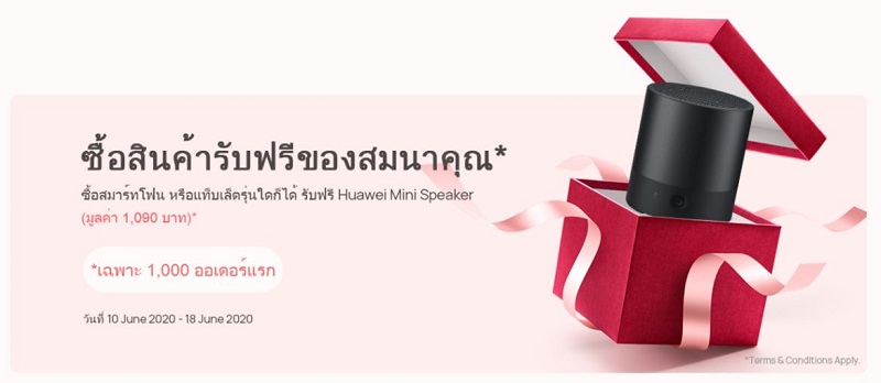 ของสมนาคุณพิเศษ ทุกการสั่งซื้อสมาร์ทโฟนหรือแท็บเล็ตรุ่นใดก็ได้ 1,000 รายการแรก รับฟรี Huawei Mini Speaker ลำโพงมูลค่า 1,090 บาท
