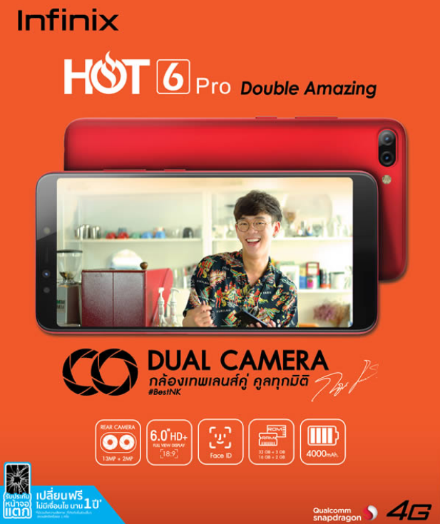 ล่าสุด Infinix แบรนด์ผู้ผลิตสมาร์ทโฟนจากประเทศจีน ได้ทำการเปิดตัว Infinix Hot 6 Pro สมาร์ทโฟนรุ่นใหม่จากตระกูล Hot Series อย่างเป็นทางการที่ประเทศอินเดีย ชูจุดเด่นที่หน้าจอ HD+ ขนาด 5.99 นิ้ว อัตราส่วน 18:9 กล้องหน้า 5MP รองรับ Bokeh Selfies และ Beauty Mode กล้องหลังเลนส์คู่ 13MP + 2MP พร้อม LED flash และสเปคการใช้งานอื่นๆ ที่ครบครัน ในราคาเบาๆ เราไปชมรายละเอียดสเปคกันเลยค่ะ
