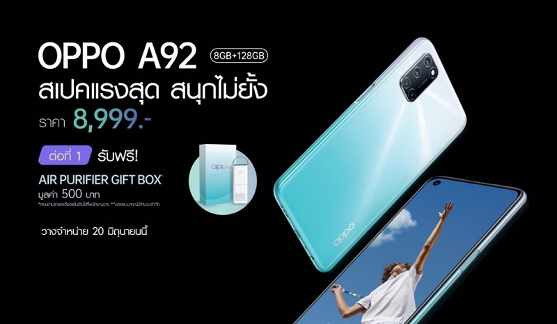 OPPO A92 วางจำหน่ายวันแรกในวันที่ 20 มิถุนายน 2563 เป็นต้นไป พร้อมโปรโมชั่นเมื่อซื้อ OPPO A92 รับฟรี! Air Purifier Gift Box โดยของแถมมีจำนวนจำกัด