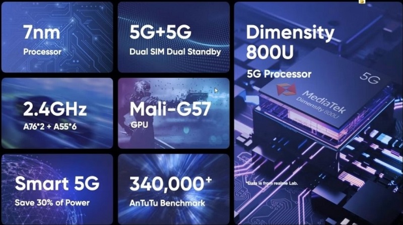ขับเคลื่อนด้วยชิป Dimensity 800U รองรับ 5G ในรุ่นท็อปสุดจับคู่กับ RAM 8GB ความจุ 128GB รัน Android 10 ครอบทับ remale UI รองรับการอัปเกรดเป็น Android 11 ครอบทับ realme UI 2.0 ในอนาคต