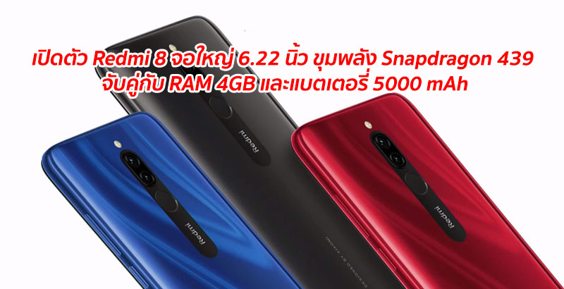 เปิดตัว Redmi 8 จอใหญ่ 6.22 นิ้ว ขุมพลัง Snapdragon 439 จับคู่กับ RAM 4GB และแบตเตอรี่ 5000 mAh