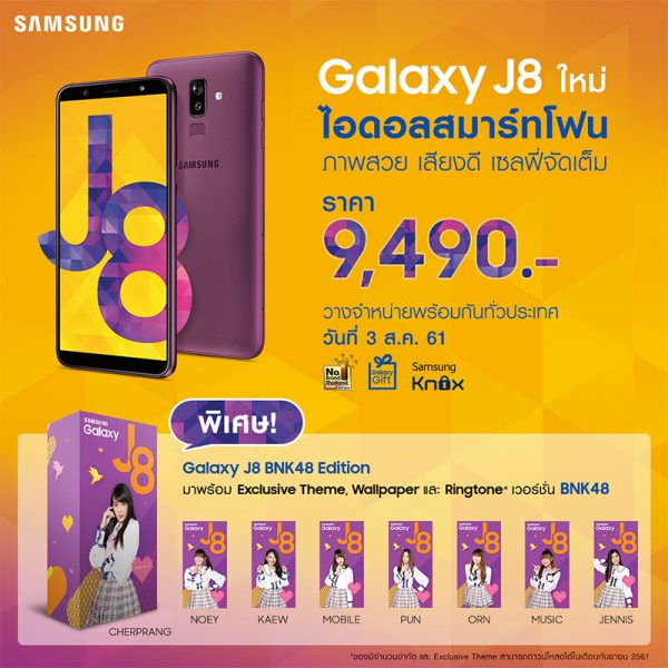 และพิเศษสุดสำหรับผู้สนใจเป็นเจ้าของสมาร์ทโฟน “กาแลคซี่ เจ 8” มาพร้อม “Samsung Galaxy J8 BNK48 Edition” แพ็กเกจดีไซน์พิเศษรูปไอดอลวง BNK48 รวม 8 ลาย โดยมาในความจุขนาด 32GB มีให้เลือกทั้งหมด 3 สี ได้แก่ สีม่วง สีทอง และสีดำ ราคาเครื่องละ 9,490 บาท จำหน่ายที่ ซัมซุง ออนไลน์ ช้อป (https://shop.samsung.com/th)