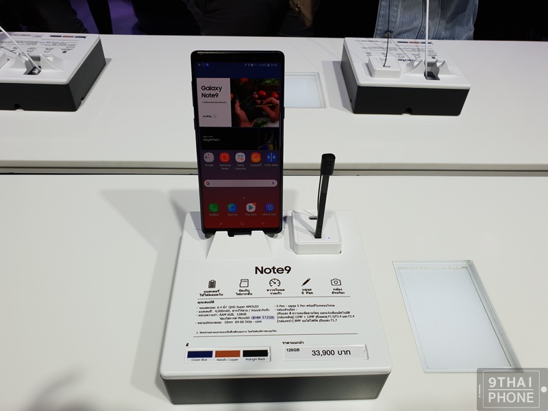 ซัมซุง กาแลคซี่ โน้ต 9 วางจำหน่ายในราคา 33,900 บาท มี 3 สีให้เลือก ได้แก่ สีโอเชี่ยนบลู (Ocean Blue) ที่มาพร้อมกับ S Pen สีเหลือง สีเมทัลลิก คอปเปอร์ (Metallic Copper) และสีมิดไนท์ แบล็ค (Midnight Black) เริ่มวางจำหน่ายพร้อมกันทั่วประเทศตั้งแต่วันที่ 24 สิงหาคมนี้ เป็นต้นไป