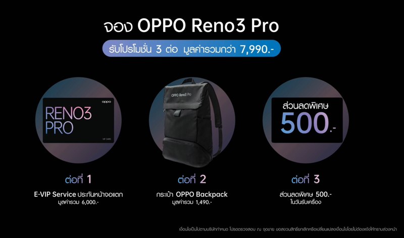พร้อมให้พรีออเดอร์ตั้งแต่ วันที่ 1 พฤษภาคม – 7 พฤษภาคม 2563 ในราคา 18,990 บาท และเมื่อจองกับ OPPO Brand Shop และตัวแทนจำหน่ายทั่วประเทศ รับไปเลยโปรโมชั่น 3 ต่อ! รวมมูลค่าทั้งหมด 7,990 บาท ดังนี้