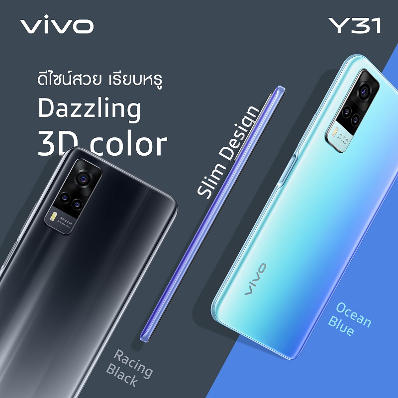 กดถ่ายภาพ Mirror Selfie กันได้แบบปังๆ เพราะตัวเครื่องของ Vivo Y31 นั้นออกแบบมาด้วยดีไซน์บางเฉียบ พร้อมสีสันสามมิติ (Dazzling 3D color) ทั้งสี Racing Black ที่มากับความเรียบหรูไร้ที่ติ และสี Ocean Blue ที่มีแรงบันดาลใจจากมหาสมุทรริมชายหาด กับระบบสแกนลายนิ้วมือด้านข้างตัวเครื่อง มอบความสะดวกให้กับการปลดล็อค