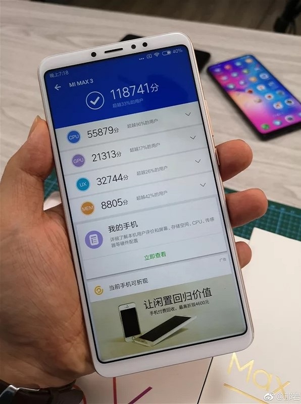 เมื่อไม่นานมานี้สื่อต่างประเทศได้มีการเปิดเผยข้อมูลการทดสอบของ Xiaomi Mi Max 3 บนแอปฯ ทดสอบประสิทธิภาพชื่อดังอย่าง AnTuTu โดย Mi Max 3 นั้นมาพร้อมกับหน้าจอแสดงผลขนาด 6.9 นิ้ว อัตราส่วน 18:9 ขุมพลังเป็นชิปเซ็ต Snapdragon 636 แบบ Octa Core ความเร็ว 1.8GHz จีพียู Adreno 509 หน่วยความจำแรม 6GB ความจุ 128GB และมีรุ่นหน่วยความจำแรม 4GB ความจุ 64GB ให้เลือกด้วย