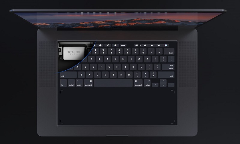 โดย MacBook Pro 2018 ภายใต้แนวคิดของ Daniel Brunsteiner ได้ออกแบบให้แผงคีย์บอร์ดและ Touch Bar เป็นแบบระบบสัมผัสโดยที่ Touch Bar สามารถขยายได้เต็มพื้นที่เพื่อรองรับการวาดเขียนที่กว้างขึ้นแถบยังมีฟีเจอร์เดิมๆ อยู่อีกด้วย และรองรับ Apple Pencil พร้อมติดตั้ง Taptic Engine